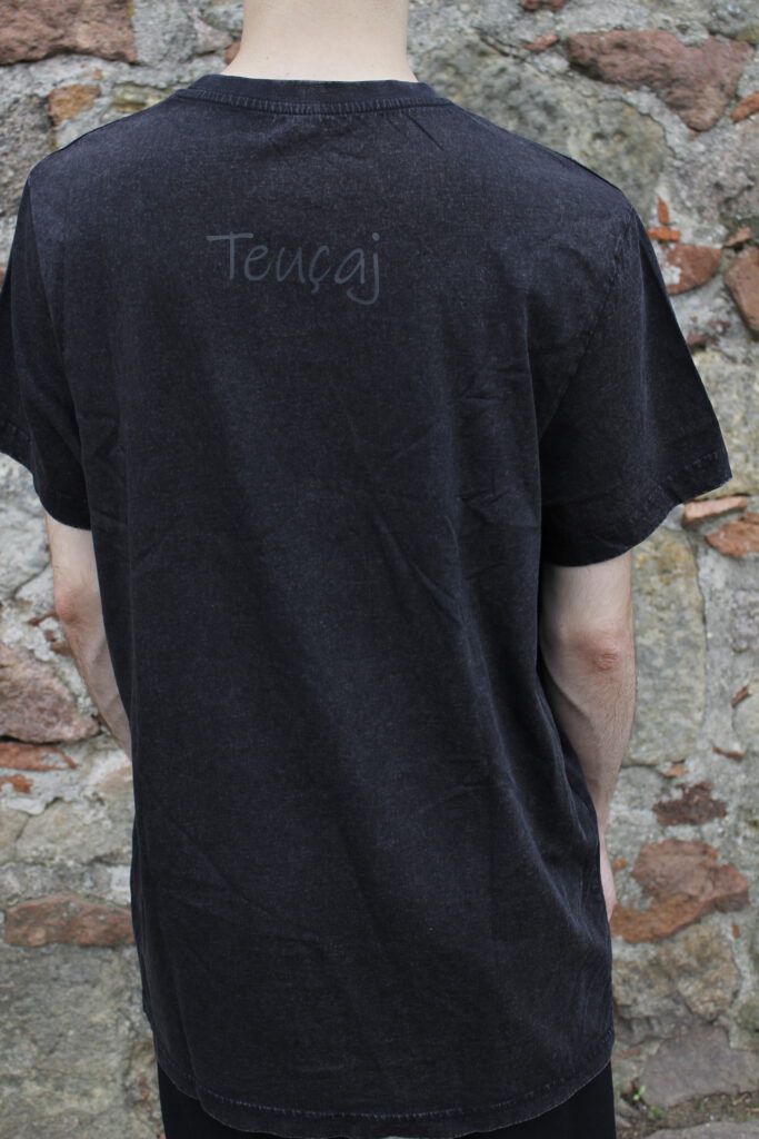Schwarzes T-Shirt in den gängigen Größen. Aufdruck vorn Logo in grau, Aufdruck hinten Schriftzug „Teuçaj“ in grau.