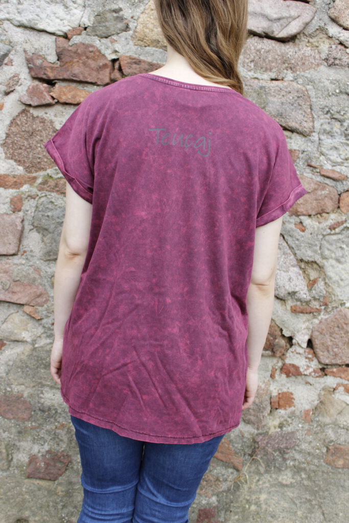 Rotes T-Shirt in den gängigen Größen. Aufdruck vorn Logo in grau auf der Brust, Aufdruck hinten Schriftzug „Teuçaj“ in grau.