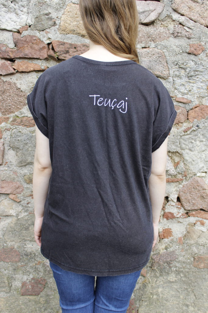 Schwarzes T-Shirt in den gängigen Größen. Aufdruck vorn Logo in weiß auf der Brust, Aufdruck hinten Schriftzug „Teuçaj“ in weiß.